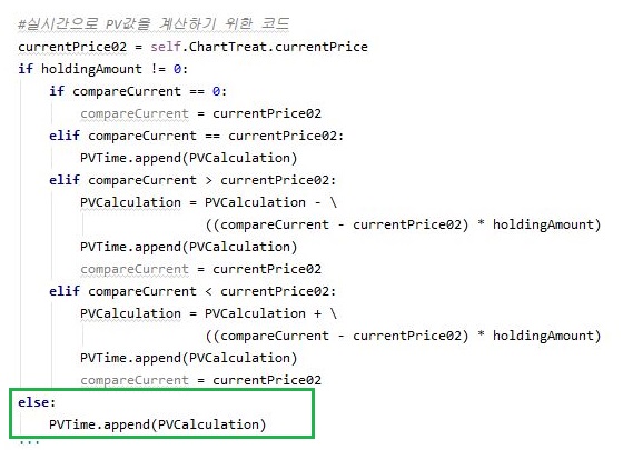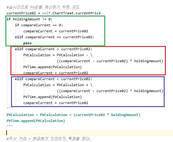 그리고 이렇게 비교를 하기 위해서 현재가가 떨어진 경우, 올라간 경우 이렇게 하나하나 비교를 해 주도록 합니다. 이게 제대로 작동하리라 생각을 하고 작업을 했습니다만..........