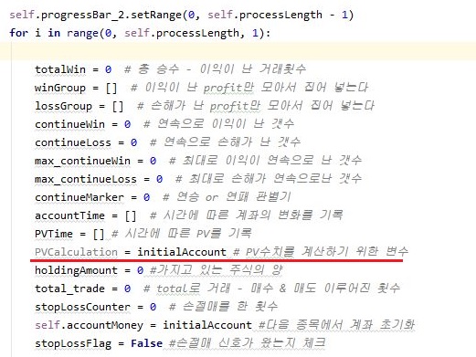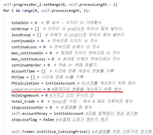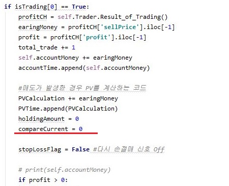 그리고 나서 현재가를 비교하는 변수는 일단 매도가 발생을 하면 다시 0으로 돌아 오라는 식으로 만들어 주도록 합니다. 이렇게 하나 만들어 주고................