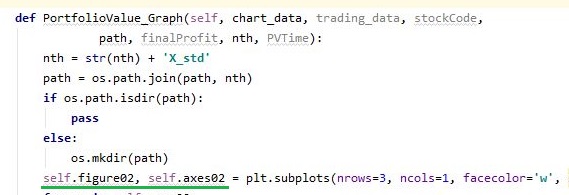 그리고 2개의 서브 플롯이 있는 그래프를 만들 것인데, 일단 상단의 그래프를 기존의 주식 그래프를 그려 주어서 비교하기 변하도록 만들어 주도록 합니다. 그리고 나서 다음으로 진행하기 위한 과정은 위 스크린샷에서 볼 수 있는 것처럼 실시간으로 변하는 포트폴리오 가치를 반영할 수 있도록 만들어 줍니다.