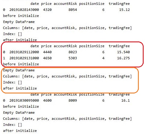 일단 이게 어떻게 된 것인지 알아보기 위해서, 먼저 하고자 하는 것은 이렇게 매수 데이터를 저장하고 있는 데이터 프레임이 초기화가 제대로 되지 않아서 생기는 문제인 것으로 생각했습니다.