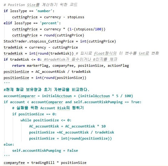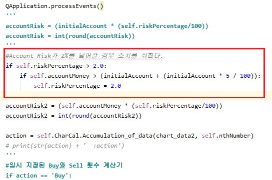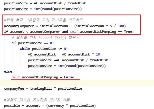 그리고 나서 다음으로 해야 할 것으로는 위 스크린샷처럼 기존의 메서드에 더 정밀한 계산을 하기 위해서 일단 초기 자본금과 계좌에 대한 리스크 퍼센트를 가지고 오도록 합니다.