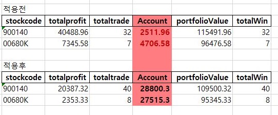 이렇게 해서 한번 결과를 비교해 보기는 보는데, 일단 기울기랄까 변동량이 급격함이 떨어진 것을 제외하면 큰 변화는 일단은 없어 보이는 상황입니다. 이래서야 이걸 가지고서 무슨 메리트가 있는지 모르겠습니다만, 아무래도 이렇게 하는 것 보다는 다음으로는 어떻게 해서 최적의 매도/매수 파라미터를 다시 지정하는 것이 나아 보이는 상황입니다.