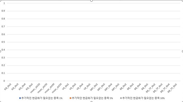 그리고 나서 이 부분인 현금화가 필요없다 = 투자의 마지막에 현금을 주로 보유하고 있다는 의미가 되는데, 이렇게 해서 되는 종목이 얼마나 되는지를 일단 살펴 보았습니다만, 이 부분은 어떻게 에러가 있는 것인지 모르겠습니다만, 일단 제대로 안 나오고 있는 것으로 보입니다. 이렇게 해서 일단 계좌가 부담해야 할 리스크는 이 정도 선으로 끝내는 것이 좋은지, 아니면 20%까지 늘려볼 필요가 있는지는 아직 잘 모르겠습니다.