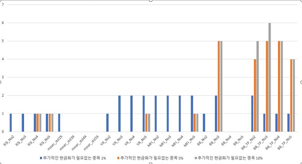 그래서 이 막대 그래프를 그려서 한번 비교를 해 보았더니, 위 스크린샷과 같이 일단 나오는 것을 확인할 수 있기는 있었는데, 일단 Account의 리스크가 커지면 커질수록 점점 이러한 종목의 갯수도 많아지는 것으로 보이기는 합니다만, 이게 전부는 아니기는 합니다.
