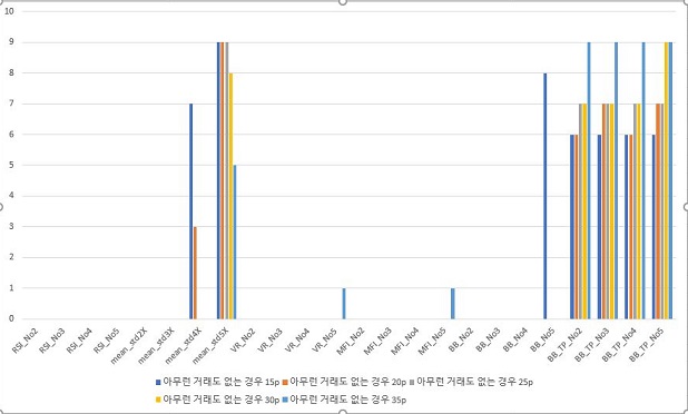 그 다음으로 일단 살펴보기로 한 것은 아무런 거래도 없는 경우인데........ 이 경우에는 일단 전체적으로 period가 길어지면 많아질 것으로 예상을 했으나, typical price를 쓰는 bollinger band의 경우만 맞아들어가고, 나머지는 특정한 규칙이 없었습니다.