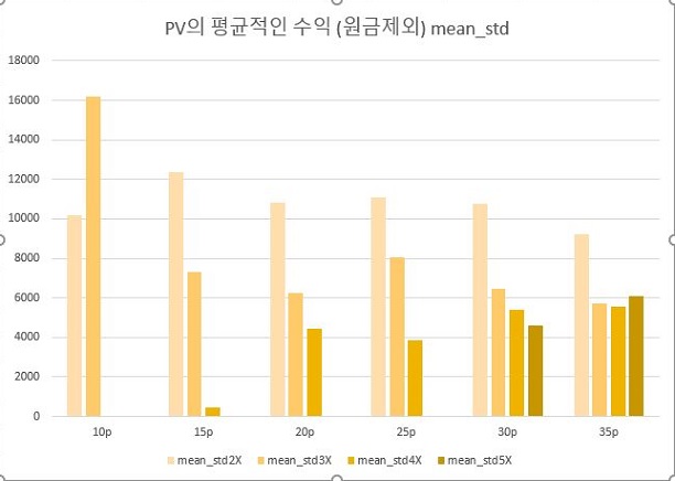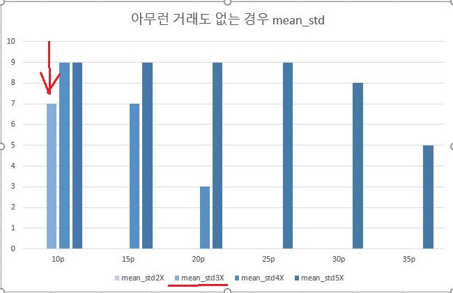 그리고 다음으로 이동평균선과 표준편차를 가지고서 한번 작업을 해 보고자 합니다. 일단 여기서는 10 period에서 나오는 3배수의 표준편차에서 가장 많은 수익을 낸 것으로 나와 있습니다.