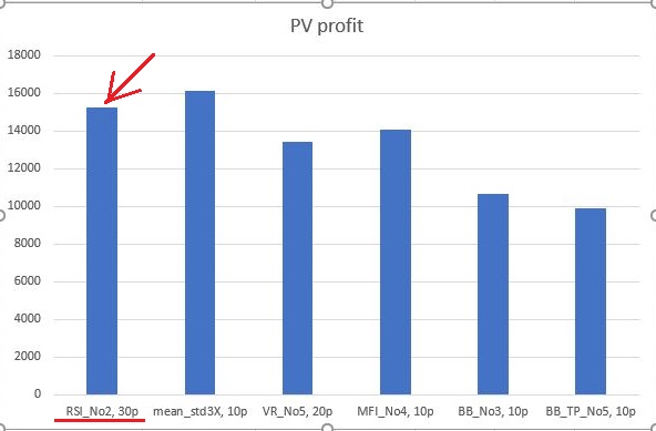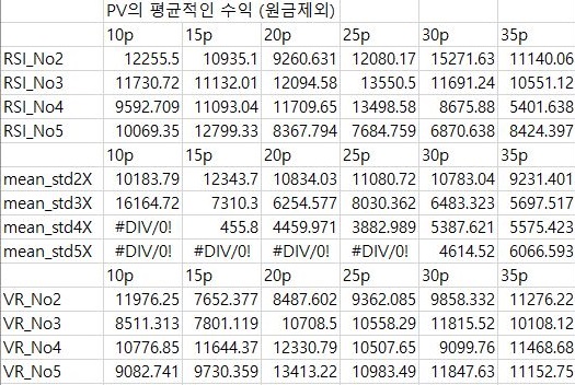 일단 원금을 제외하고서는 얼마나 많은 수익을 거두었는지 한번 살펴 보고자 합니다. 여기서 하나 알 수 있는 것으로는 우선은 30period에서 No2의 조건에서 RSI는 가장 많은 수익을 거둔 것으로 나오고 있습니다.