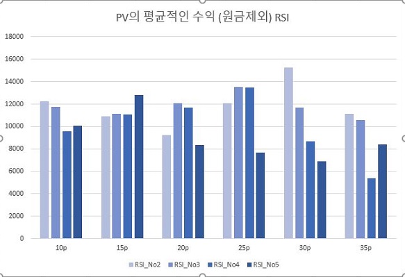 일단 원금을 제외하고서는 얼마나 많은 수익을 거두었는지 한번 살펴 보고자 합니다. 여기서 하나 알 수 있는 것으로는 우선은 30period에서 No2의 조건에서 RSI는 가장 많은 수익을 거둔 것으로 나오고 있습니다.