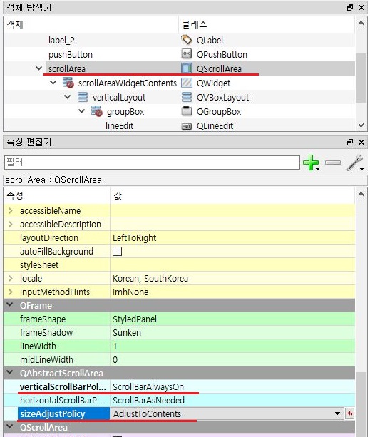 그래서 일단 이 문제를 해결해 보기 위해서, 먼저 QtDesigner에서 위 스크린샷에서 보이는 것처럼, 일단 설정들을 해 놓도록 합니다.