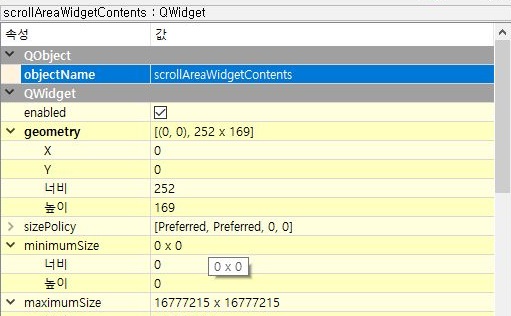 먼저 위 스크린샷을 보시면 알 수 있듯이, 일단 scrollArea에서는 하위로 widget이 있기는 있습니다. 이게 왜 중요하느냐 하면.................