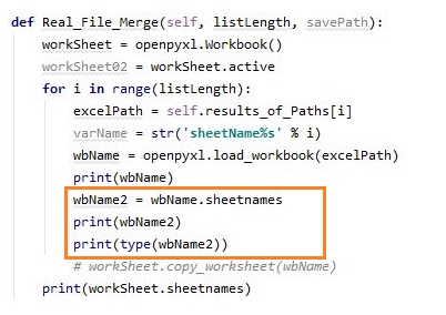 우선 제대로 시트 이름을 가지고 올 수 있었으며, 다음으로 이 가지고 온 형식이 리스트라는 형식이라는 것도 알 수 있었습니다. 이제 다음과 같이 해 보도록 합니다.