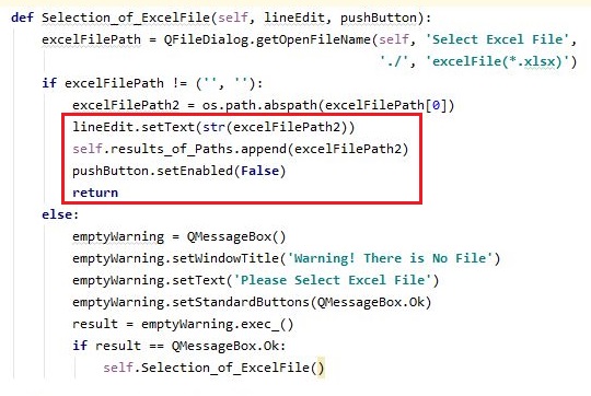 일단 먼저 해야 할 것은 첫번재로 엑셀 파일을 선택하는 메서드를 누르고 나면, 그 다음에는 경로를 리스트에 추가하고 나서, 버튼을 불능화 시켜야 합니다.