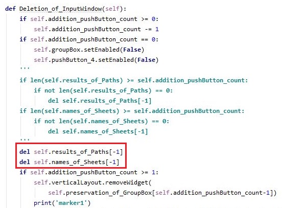 일단 del 리스트 이름 [-1] 이렇게 하는 식으로 리스트의 제일 마지막에 들어온 요소를 삭제하는 것은 가능하다고 합니다. 그러므로 일단 이렇게해서 제거 버튼을 누를 때 마다, 리스트에 들어온 각각의 엑셀파일 경로와 시트 이름은 제거해 주도록 합니다.