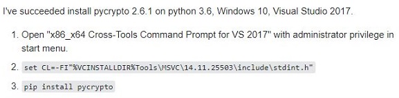 그리고 나서 암호화를 하기 위해서, 일단 만들어 놓은 모듈인 pycrypto라는 것을 또 설치해 주도록 합니다. 그런데 설치가 문제없을 것으로 생각한 것과는 다르게...........