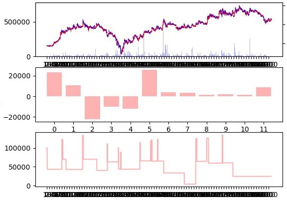 그리고 수익의 총합을 모두 계산해 보았더니, 위 스크린샷에서 확인할 수 있는 그래프에서 알 수 있듯이, 일단 제가 사용하게 될 메인이 되는 매도/매수 룰의 조건이 가장 좋지 않은 상황이기도 합니다.