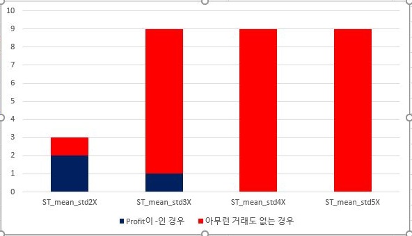 거기다가 profit의 총합까지 오면, 3배의 표준편차를 사용하는 매도/매수 룰에서는 아예 손해를 확실하게 본 것을 확인할 수 있었습니다. 이래서야 2배수 이상은 아예 쓸모가 없다는 것을 확실하게 확인할 수 있을 뿐이었습니다.