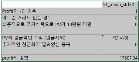 거기다가 profit의 총합까지 오면, 3배의 표준편차를 사용하는 매도/매수 룰에서는 아예 손해를 확실하게 본 것을 확인할 수 있었습니다. 이래서야 2배수 이상은 아예 쓸모가 없다는 것을 확실하게 확인할 수 있을 뿐이었습니다.