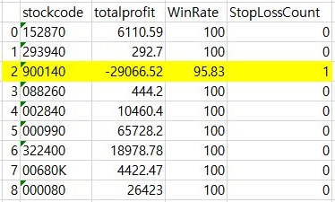 그렇게 해서 어떤 종목이 계속해서 손해를 내었는가 하면, 위 스크린샷에서 볼 수 있는 것처럼, 일단 계속해서 이 900140이라는 종목이 문제인데, 이에 대해서는 아직은 어떻게 종목을 걸러낼 지에 대해서는 없기 때문에 그냥 넘어가고, 다른 조건을 변화시켜서 무언가 방법을 모색하고 있는 중 입니다.