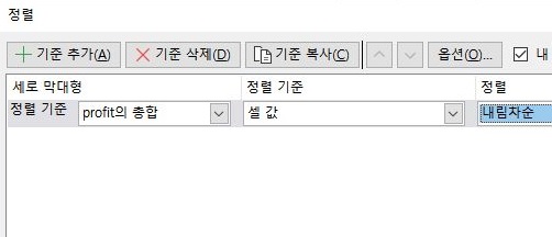 그래서 이번에는 엑셀에 있는 이 데이터 정렬 기능을 이용해서 보려고 했습니다. 일단 여기서는 위 스크린샷에서 볼 수 있는 것처럼, profit의 총합을 가지고서 내림차순으로 정렬해 보았습니다.
