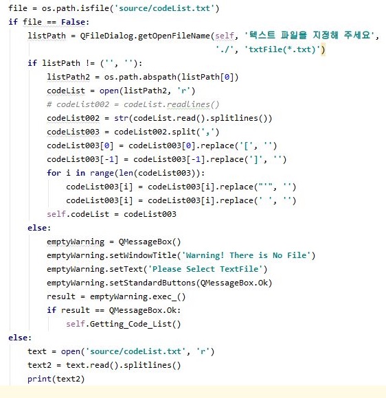 먼저 해야 할 것은 일단 텍스트 파일에서 읽어온 코드 리스트를 리스트 형태로 변환시켜서 어떻게 사용할 수 있도록 만들어 주는 식으로 바꾸어야 합니다.