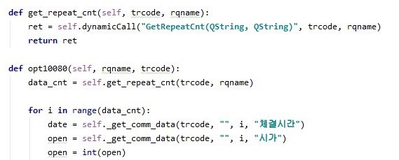 그리고 나서 다음으로 해야 할 것으로는 kiwoom.py에 위 스크린샷과 같이 일단은 RQ를 받을 것을 대비해서 해당하는 메서드도 가지고 오도록 합니다.