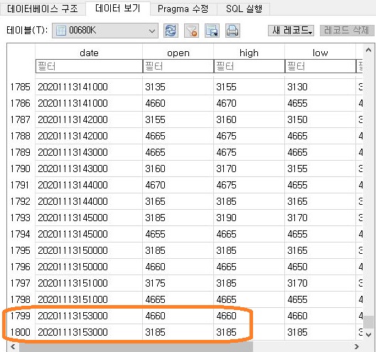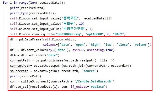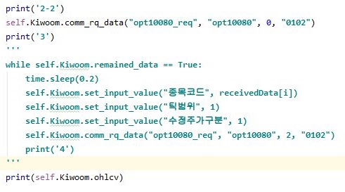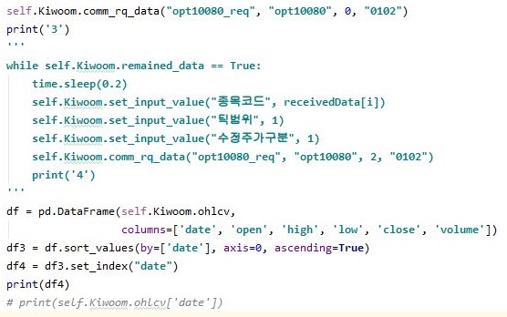 그리고 나서 kiwoom.py에서도 이렇게 주가를 가지고 왔으면, 이걸 그냥 있을 것이 안이라, 일단 데이터 베이스 파일에 저장할 수 있도록 만들어 주도록 합니다.