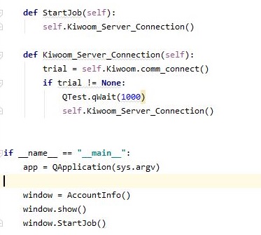 그리고 나서 다으믕로 해야 할 것은 일단 키움증권 서버와 연결을 하는 메서드를 집어넣어 주어서 제대로 뜨는 것을 확인할 수 있느냐 하는 것 입니다.