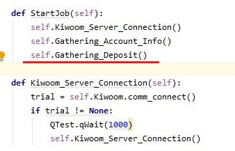 그리고 나서 다음으로 할 수 있는 것으로는 일단, 위 스크린샷에서 볼 수 있는 것처럼, 우선 키움증권 서버에 연결한 다음에는 이후 계좌정보를 얻어올 수 있도록 조치를 취해 보도록 합니다.