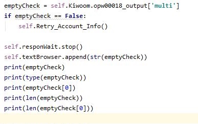 그리고 나서 다시 한번 계좌정보를 가지고 오기 위한 py파일로 가서는 위 스크린샷에서 볼 수 있는 것처럼, 일단은 이걸 초기화 하는 작업을 먼저 해 주도록 하고, emptyCheck에는 해당하는 TR의 결과를 볼 수 있도록 만들어 주도록 변경을 했습니다.