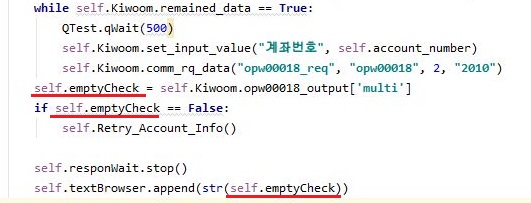 그리고 나서 다시 한번 계좌정보를 가지고 오기 위한 py파일로 가서는 위 스크린샷에서 볼 수 있는 것처럼, 일단은 이걸 초기화 하는 작업을 먼저 해 주도록 하고, emptyCheck에는 해당하는 TR의 결과를 볼 수 있도록 만들어 주도록 변경을 했습니다.