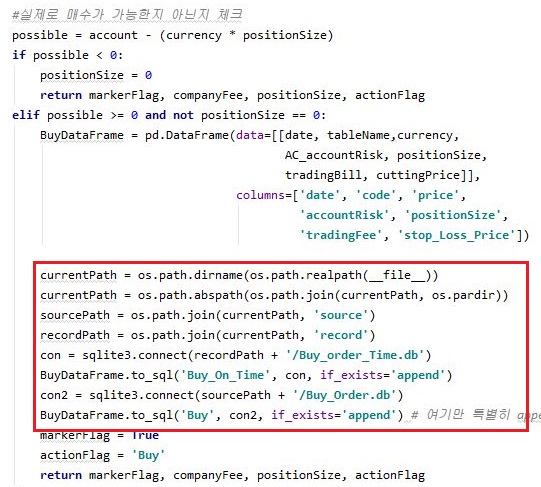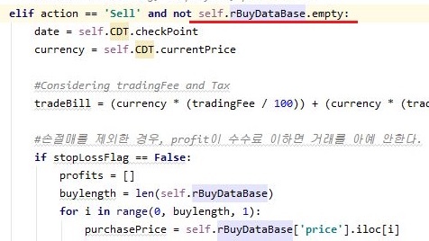 그리고 나서 이렇게 원래는 매수를 했다는 데이터 프레임이 비어 있는지 여부를 먼저 체크 했습니다. 왜냐하면 이게 비어 있다 = 매수한 사실이 없는데 매수가 될리 없기 때문입니다.