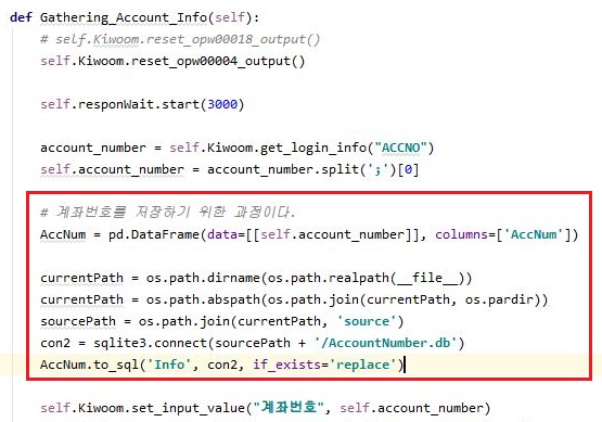 그리고 나서 다음으로 해야 하는 것으로는 이제, 계좌번호를 가지고 오는 것이 문제가 되었기 때문에, 다른 py파일로 가서 또 데이터 베이스를 만들어서 계좌번호를 저장하도록 합니다.