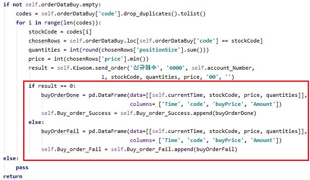 그리고 나서 키움증권 서버에서 나온 결과를 보고서, 이게 0이라고 주문을 넣는데 성공한 케이스라면, 이 케이스에 해당하는 내용을 일단 넣어 보도록 합니다.