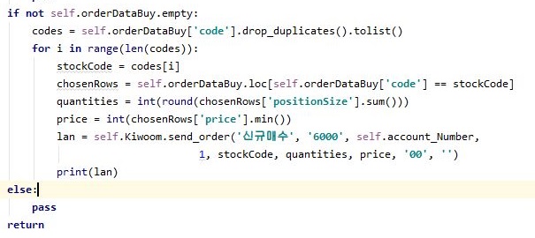 먼저 매수 주문을 넣는 데이터 프레임이 비어있지 않은 상황이라면, 일단 이걸 출력하도록하고, 그 다음에는 겹치는 종목 코드는 모두 drop시키도록 합니다.
