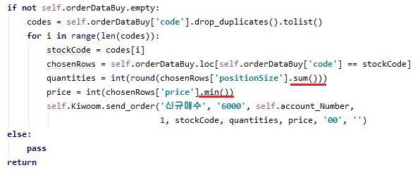 그리고 나서 일단 매수하는 수량은 모두 합으로 하고, 매수가는 지정된 가격을 하기 때문에, 가장 작은 가격으로 주문을 넣도록 어떻게 프로그램을 짰습니다.