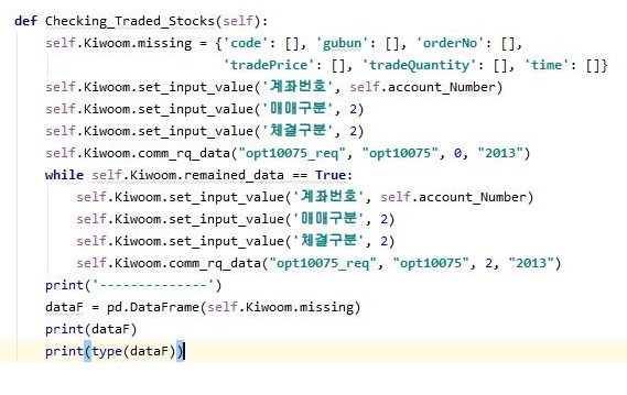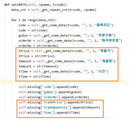 그리고 이렇게 체결이 확인이 되는 정보를 가져오기 위해서는 위 스크린샷에서 볼 수 있는 것처럼, 일단 kiwoom.py에서 해당하는 정보를 가지고 올 수 있어야 합니다.