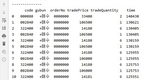 그리고 나서 다음으로 봐야 하는 것으로는 바로 위 스크린샷처럼 일단 문제가 하나 생겼습니다. 바로 키움증권 서버와 연결되어 있는 시간이 짧기 때문에, 체장 데이터가 송출되는 시점에서 접속이 언제나 끊겨 있습니다. 그래서 위 스크리냣에서 볼 수 있는 것처럼 항상 체결이 되었는지 체크할 필요가 있습니다.