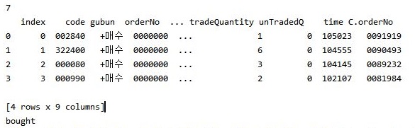일단 이렇게 해서 지난번에 거래가 된 종목의 리스트를 가지고 올 수 있기는 있게 되었습니다. 즉, 이런걸로 체결이 된 정보는 가지고 올 수 있다는 것 입니다.