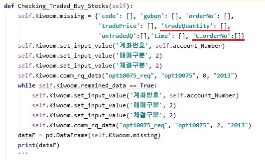 일단 이렇게 해서 매수를 한 종목들만 나오기는 나오는 것을 확인할 수 있기는 있었습니다. 문제는 다른 데에 있기는 있습니다.