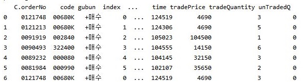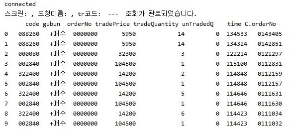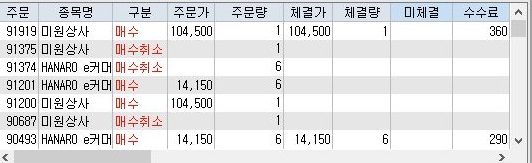 일단 이렇게 해서 지난번에 거래가 된 종목의 리스트를 가지고 올 수 있기는 있게 되었습니다. 즉, 이런걸로 체결이 된 정보는 가지고 올 수 있다는 것 입니다.
