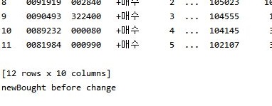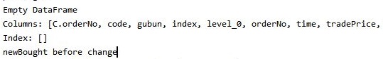 그리고 나서 이제서야 제대로 이 새로 매수한 것이 없는 상황에서는 아무것도 없는 빈 데이터 프레임이 나오는 것을 확인할 수 있었습니다. 이렇게 해서 하나 해결은 했는데, 아직도 해결하지 못한 부분이 여러개 있습니다. 이에 대해서는 차근차근 올리도록 하겠습니다.