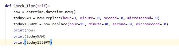 그리고 나서 다음으로 해야 할 것으로는 체크 타임이라는 메서드를 만들어서 장이 서 있는 시간이 아니면 시작하지 말고, 종료된 다음이면 자동으로 프로그램을 종료하라는 식으로 어떻게 만들어 주었습니다.