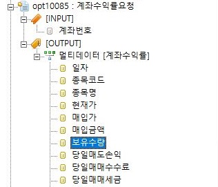 우선 여기서 처음으로 주목한 것은 opt10085라고 하는 TR에 주목을 하였습니다. 이 TR에 가서는 일단 보유수량등을 알 수 있다는 것을 알았습니다.
