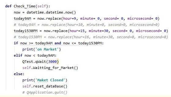 그리고 나서 체크타임에 가서, 이게 장이 종료된 시간이 지나고 나서는 이제 위 스크린샷에서 볼 수 있는 것처럼 일단 새로운 메서드를 실행할 수 있도록 만들어 주도록 합니다.