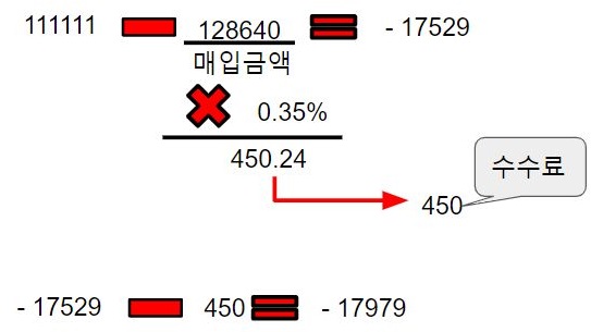 일단 생각외로 엄청나게 많은 양을 매수한 이 종목에 대헛 알아보고자 합니다. 일단 여기서 수수료를 소수점 아래 반올림 해서 861로 했는데, 그러자 거의 나누어 놓은 계죄의 111111만원에서 245905원어치를 매입했으니, 당연하다면 당연하게도 이건 마이너스를 기록하게 될 것 이 뻔합니다. 그후 수수료까지 계산해 보니, 예상치 않게 합리적으로 맞는 액수라는 것을 알 수 있었습니다.