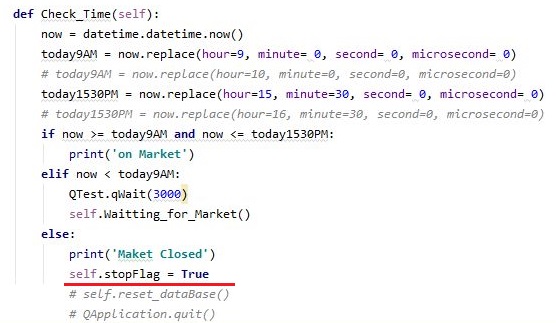 시간을 체크하는 메서드로 가서는 위 스크린샷과 같이 바로 종료를 하는 것이 아니라 그냥 플래그를 일단 False에서 True로 바꾸어 주도록 만들어 봅니다.