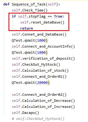 그리고 나서 작업의 시퀀스에 가서는 위 스크린샷에서 볼 수 있는 것과 같이 일단은 시퀀스를 지정하는 메서드에 가서, 이 플래그가 True되어 있으면 종료하기 위한 메서드를 실행시키라고 명령을 내입니다.