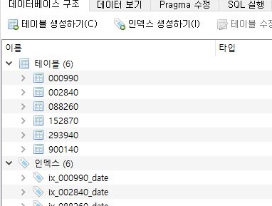 그런데 잘 가는것 같은 프로그램이 시작하자 마자 문제에 마주치게 됩니다. 어떻게 된 것인지 모르겠습니다만, 일단 위 스크린샷을 보시면 알 수 있듯이, 제대로 9개의 종목을 다 가지고 오지 못해서, 일부 데이터 베이스의 테이블이 누락된 상태로 시작을 하는 것 입니다.