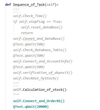 그래서 이전에 있었던 계좌의 확정이나 스톡을 체크하는 메서드를 다시 주석처리에서 불러 오도록 합니다. 이렇게 해서 다시한번 실행을 시켜 보도록 했습니다.