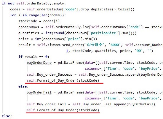 그리고 나서 다음으로 진행하고자 하는 것으로는 확실하게 중복해서 어떻게 주문이 들어가는 현상을 막아보기 위해서, 일단 키움증권에 매도나 매수주문이 성공하지 않아도 그냥 order안에 있는 주문을 제거해 보도록 합니다.